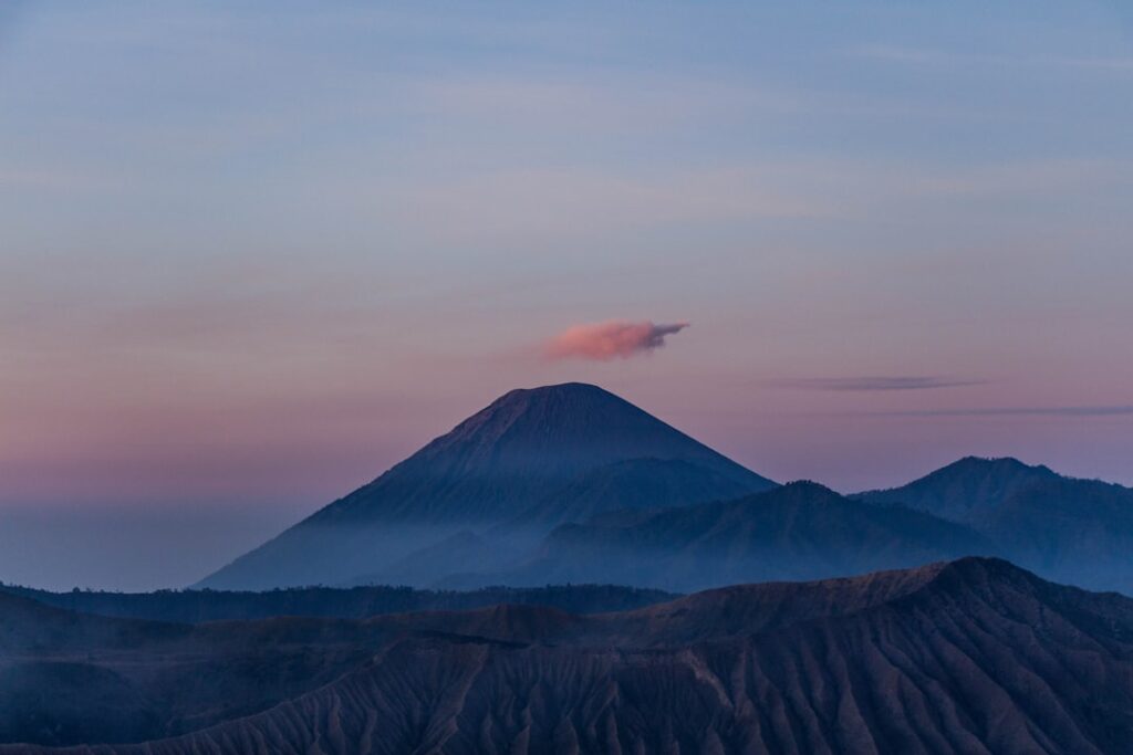 A mountain covered in fog under a purple sky, Bromo Tengger Semeru National Park, Indonesia