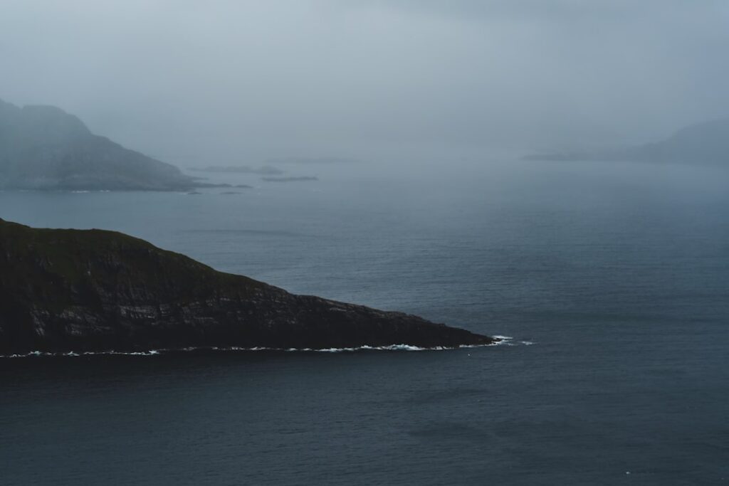 A foggy day at the ocean with a large rock formation, Kodiak Island, USA