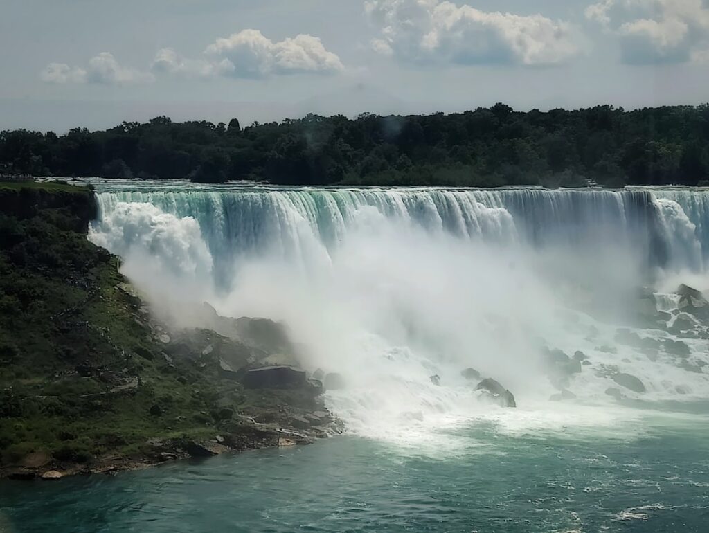 A boat is in the water near a waterfall, Niagara Falls, Canada