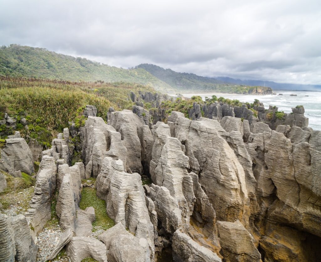 A large rock formation with a mountain in the background, Tsingy de Bemaraha, Madagascar