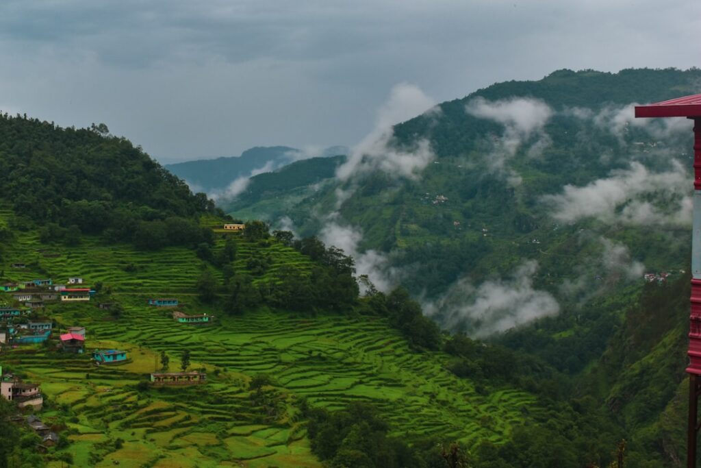 A lush green hillside covered in trees and clouds, Uttarakhand, India