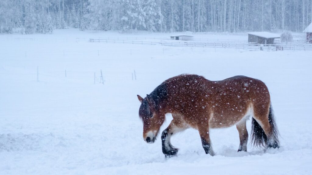 Brown horse standing near pine trees, Whitehorse, Canada